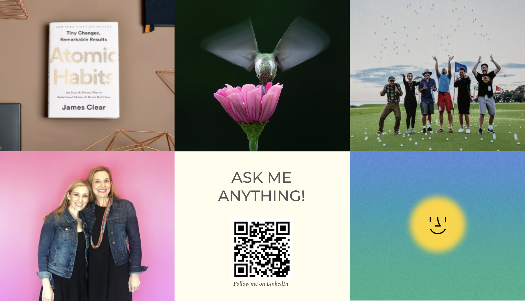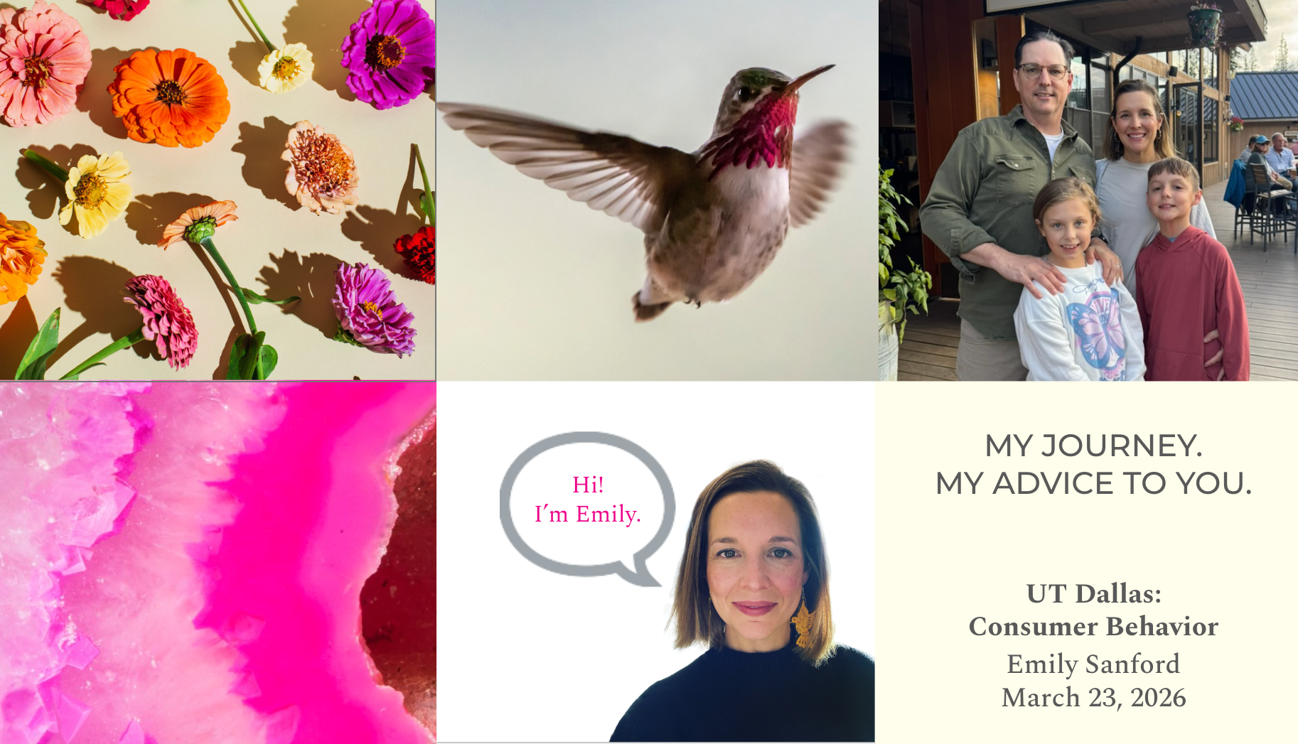 I mean, I had a deck. A really beautiful one, actually. Intentionally visual, very few words — each slide anchored in my actual career story. But the first slide was something different. It was a grid of images that had nothing to do with marketing: a hummingbird. Pink agate (my dad was a geologist — he'd probably be offended by the hot pink version, but here we are). Flowers. My family. Things I love and don't hide. That slide was a deliberate choice — a way of saying a whole human being just walked in, not just a resume. Because showing up authentically — at work, in a classroom, in a boardroom — is something I've come to believe in completely.
