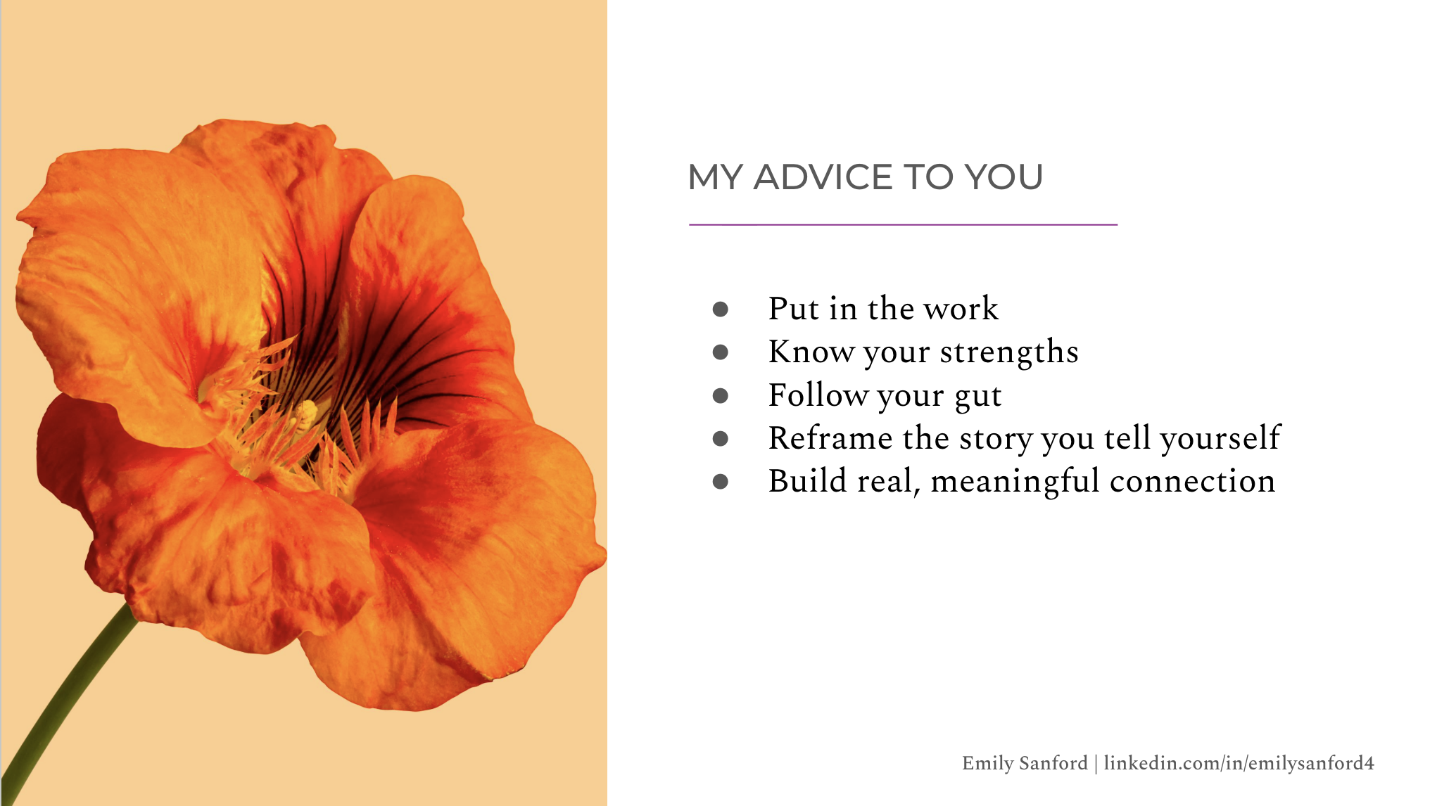 The five things I left them with — which, honestly, are the five things I'd tell my younger self: